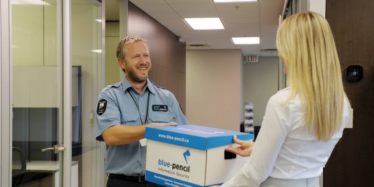- Drop-off shredding: Ideal for very small quantities — like one or two boxes of paper. Simply bring your private documents to a secure Blue-Pencil drop-off location, and they’ll be shredded on your behalf for a low, one-time fee.